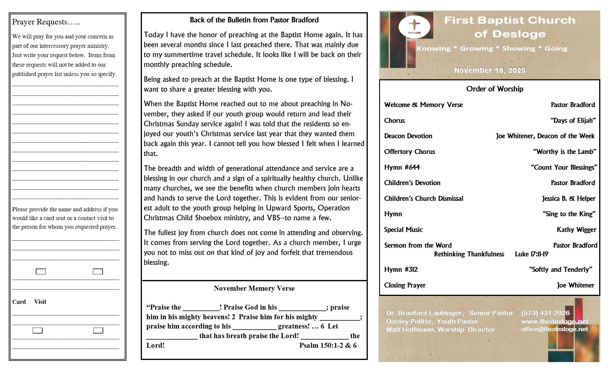 Greetings! It is great that the Lord has led you to our church’s webpage. We hope that this site will help you get acquainted with our church and who we are. However, the best way to get to know us is by being with us! Please visit us soon. Although we are theologically a conservative church, you are more than welcome to come dressed as you are. Some wear suits and some wear dresses. Others wear shorts, jeans, polos or T-shirts. Our worship language is eclectic ranging from contemporary to hymns and everything in between. Each Sunday there is a choir, praise team, and various musicians. Pastor Bradford’s sermons are preached from the English Standard Version of the Bible, are applicable to life, and are shorter than most! Utilize our media tab to get an idea of what his sermons are like.
