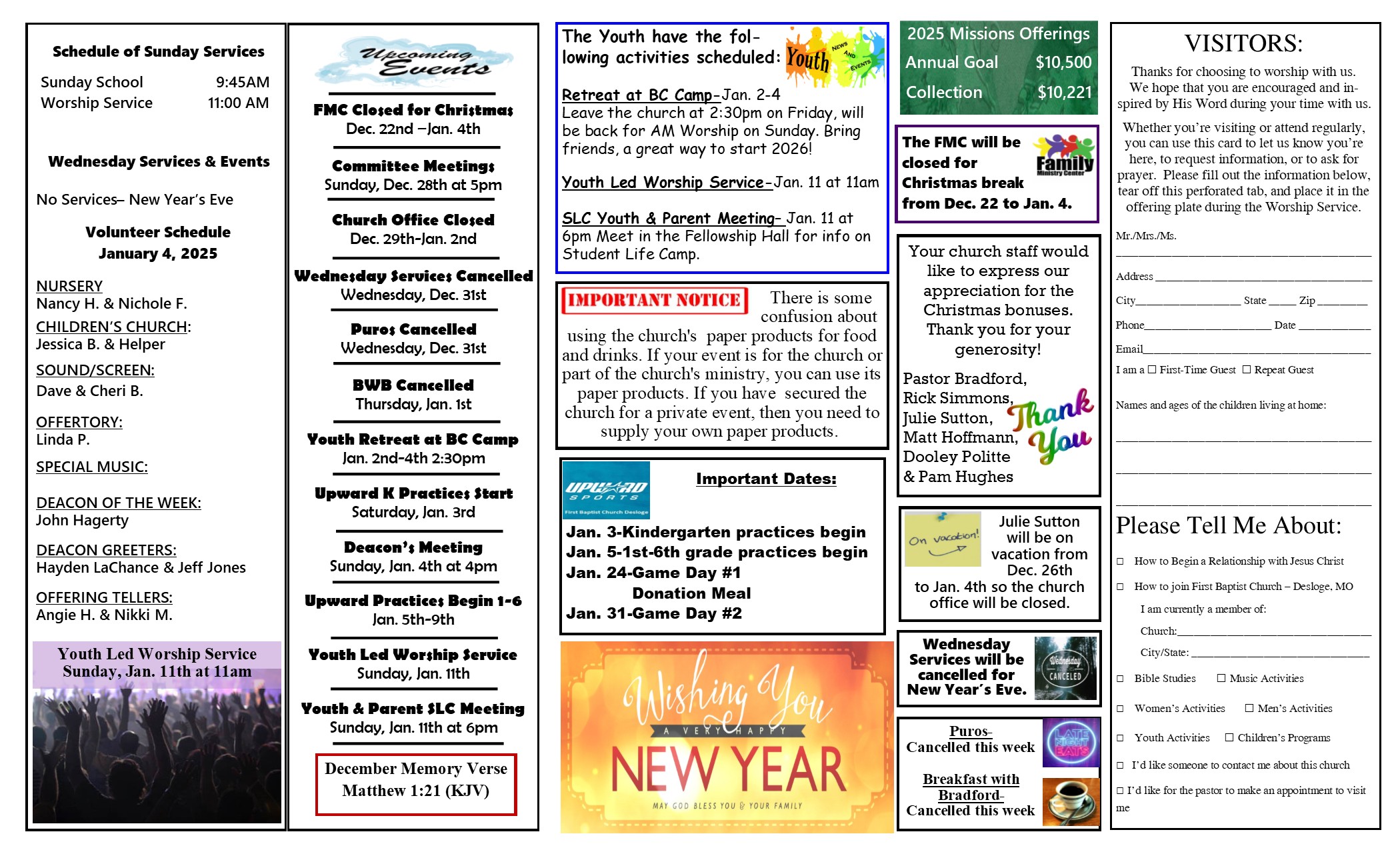 Greetings! It is great that the Lord has led you to our church’s webpage. We hope that this site will help you get acquainted with our church and who we are. However, the best way to get to know us is by being with us! Please visit us soon. Although we are theologically a conservative church, you are more than welcome to come dressed as you are. Some wear suits and some wear dresses. Others wear shorts, jeans, polos or T-shirts. Our worship language is eclectic ranging from contemporary to hymns and everything in between. Each Sunday there is a choir, praise team, and various musicians. Pastor Bradford’s sermons are preached from the English Standard Version of the Bible, are applicable to life, and are shorter than most! Utilize our media tab to get an idea of what his sermons are like.