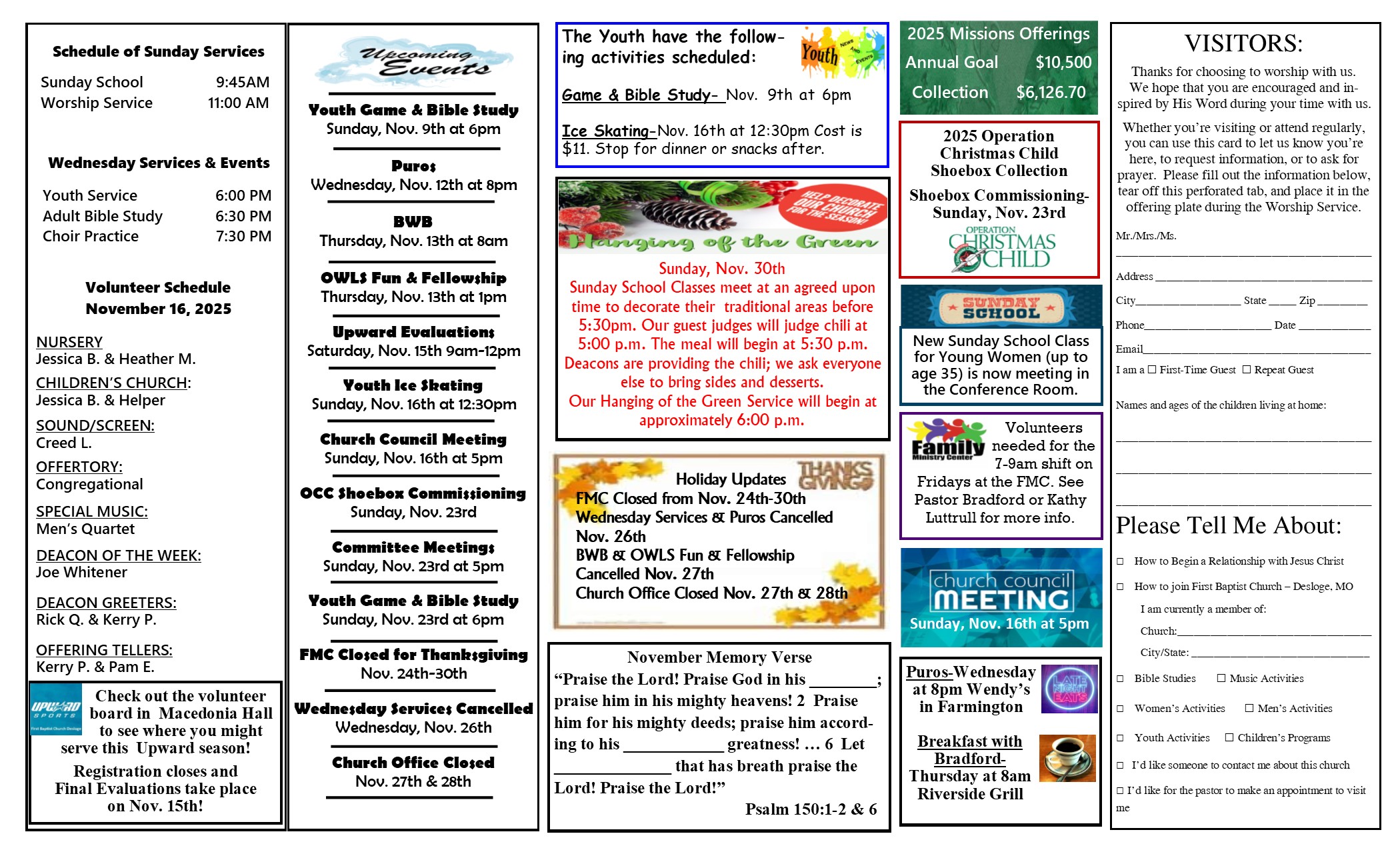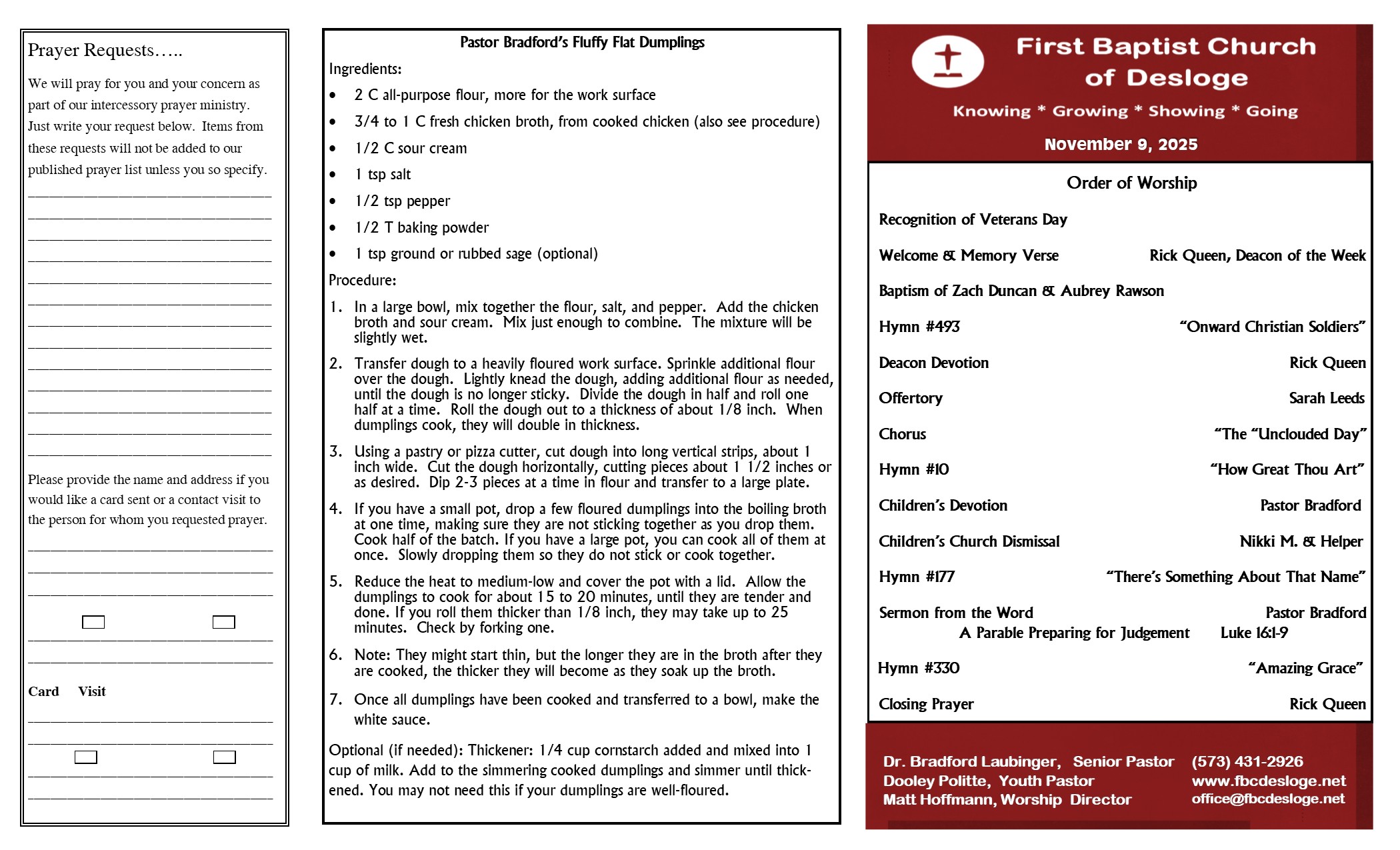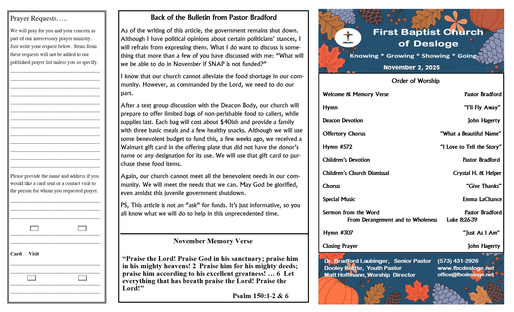 Greetings! It is great that the Lord has led you to our church’s webpage. We hope that this site will help you get acquainted with our church and who we are. However, the best way to get to know us is by being with us! Please visit us soon. Although we are theologically a conservative church, you are more than welcome to come dressed as you are. Some wear suits and some wear dresses. Others wear shorts, jeans, polos or T-shirts. Our worship language is eclectic ranging from contemporary to hymns and everything in between. Each Sunday there is a choir, praise team, and various musicians. Pastor Bradford’s sermons are preached from the English Standard Version of the Bible, are applicable to life, and are shorter than most! Utilize our media tab to get an idea of what his sermons are like.